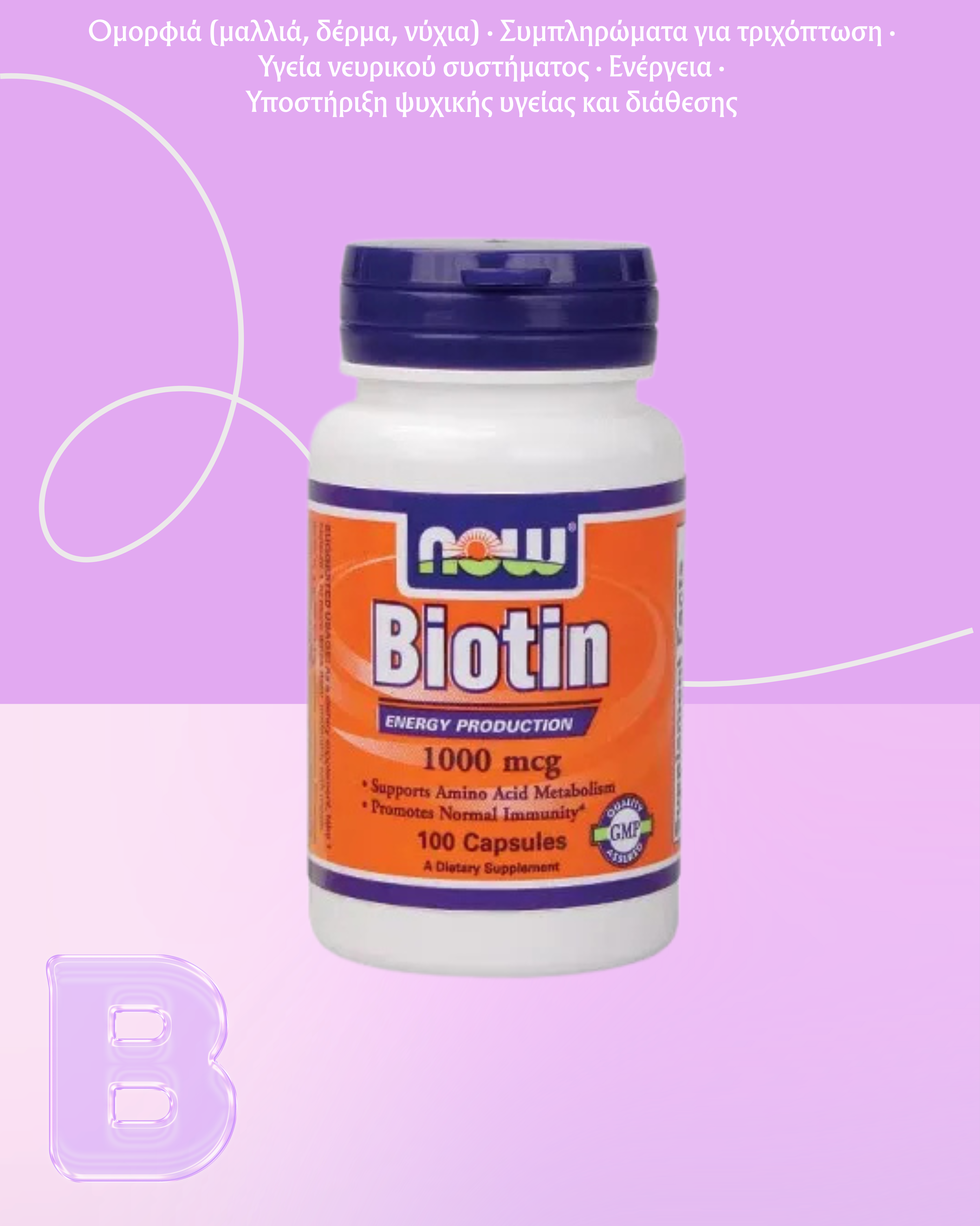 Η NOW Biotin είναι ένα συμπλήρωμα διατροφής που περιέχει βιοτίνη – μια υδατοδιαλυτή βιταμίνη που παίζει βασικό ρόλο σε πολλές μεταβολικές διεργασίες του οργανισμού. Είναι απαραίτητη για τη φυσιολογική ανάπτυξη, τη σύνθεση πρωτεϊνών καθώς και για την υγεία του δέρματος, των μαλλιών και των νυχιών.