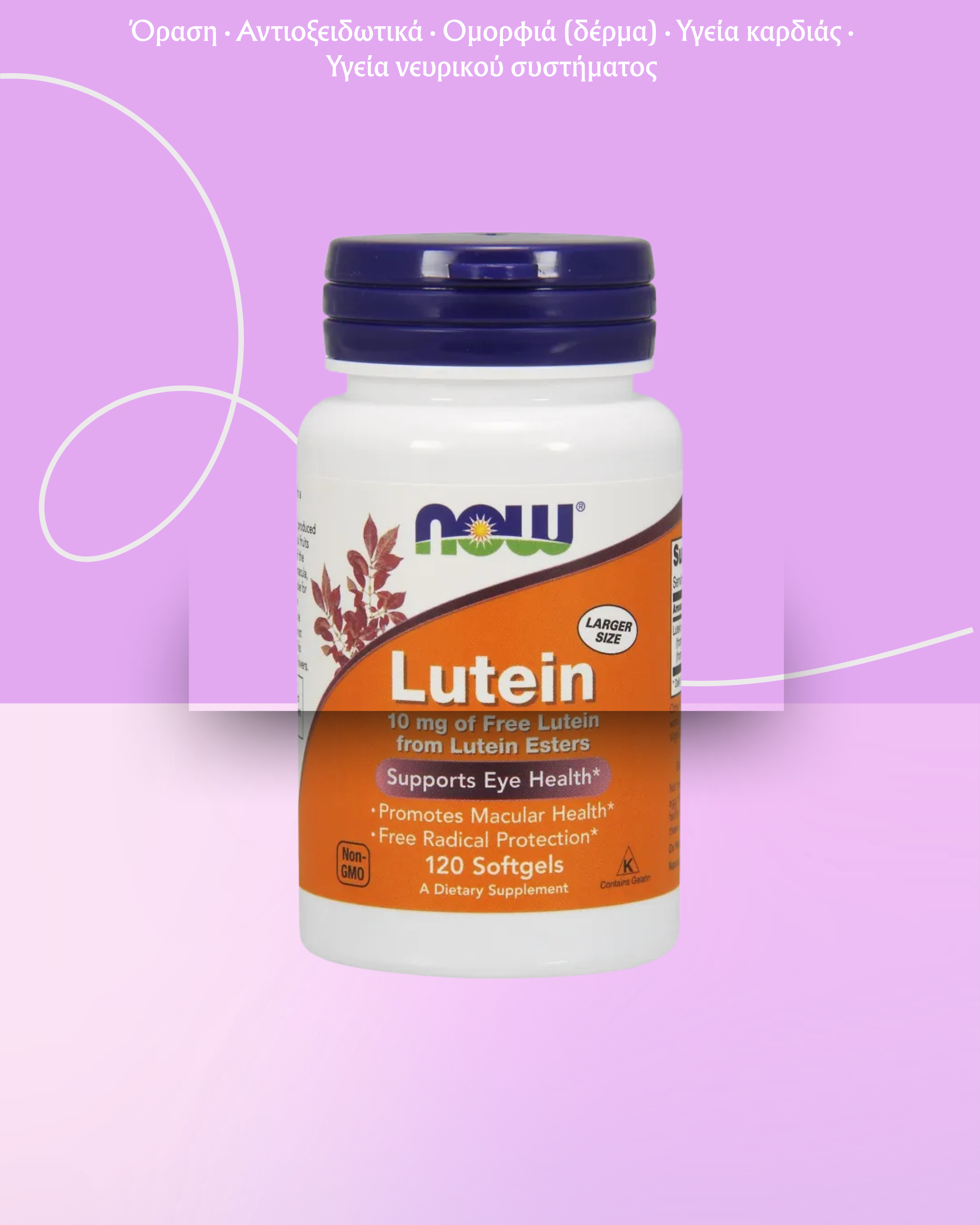 Η NOW Lutein 10 mg είναι ένα συμπλήρωμα διατροφής που περιέχει λουτεΐνη – ένα φυσικό πορτοκαλοκόκκινο καροτενοειδές που προέρχεται από τα άνθη κατιφέ (Tagetes erecta). Η λουτεΐνη είναι μία από τις κυρίαρχες χρωστικές της ωχράς κηλίδας – της περιοχής του ματιού που είναι υπεύθυνη για την κεντρική όραση. Έχει προστατευτικό ρόλο, εξουδετερώνοντας τις ελεύθερες ρίζες που δημιουργούνται, μεταξύ άλλων, από την ηλιακή ακτινοβολία. Εντοπίζεται επίσης στο δέρμα, όπου συμβάλλει στη φυσική αντιοξειδωτική άμυνα.