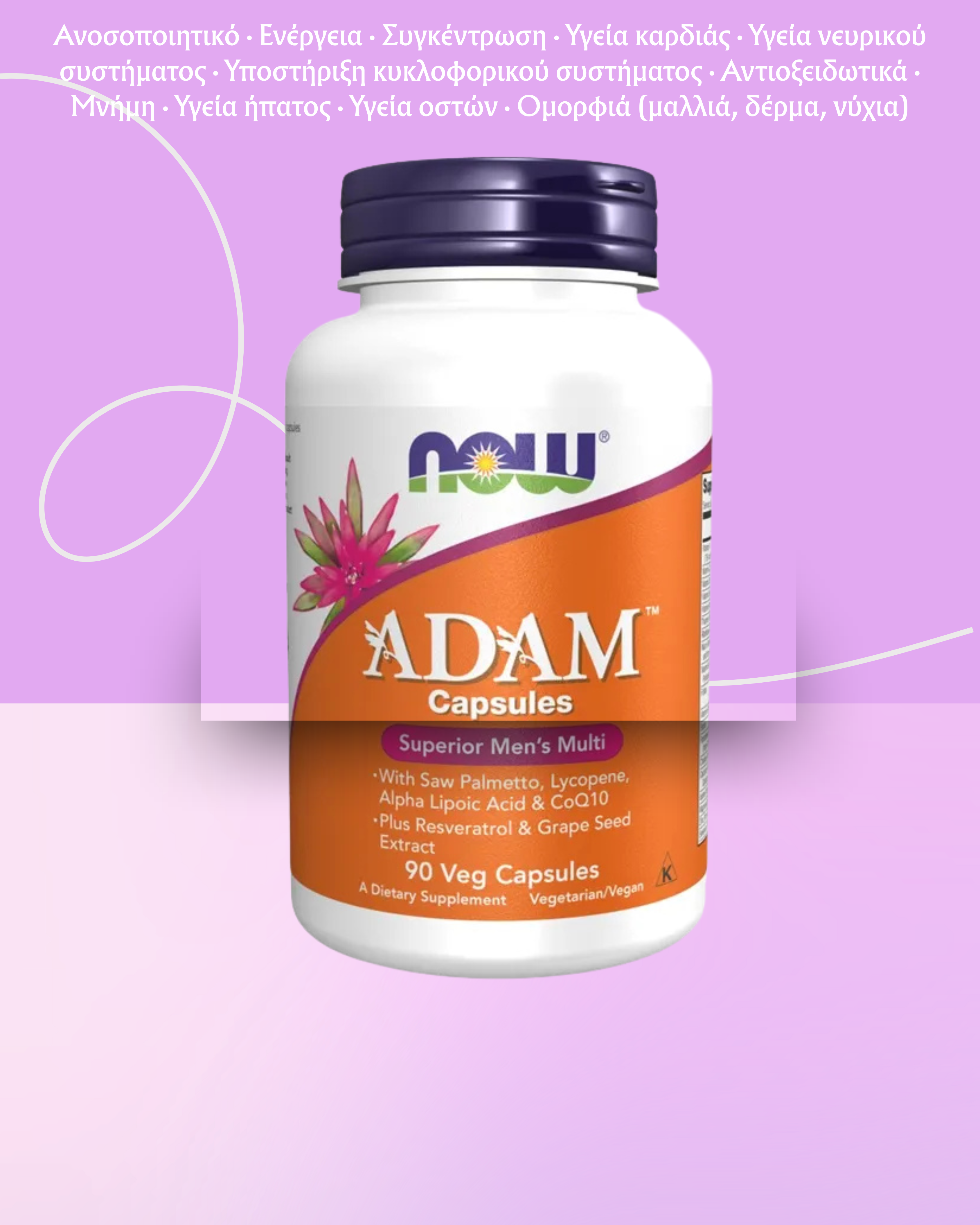 Η ADAM™ Superior Men’s Multi της NOW® είναι μια ολοκληρωμένη πολυβιταμίνη ειδικά σχεδιασμένη για άνδρες. Περιέχει βασικές βιταμίνες και μέταλλα, καθώς και πρόσθετα συστατικά όπως Saw Palmetto, φυτοστερόλες, λυκοπένιο και συνένζυμο Q10. Η έκδοση σε φυτικές κάψουλες είναι ιδανική για όσους αποφεύγουν τη ζελατίνη και προτιμούν καθαρά φυτική μορφή συμπληρωμάτων.